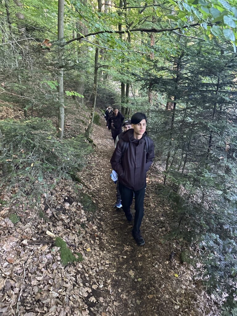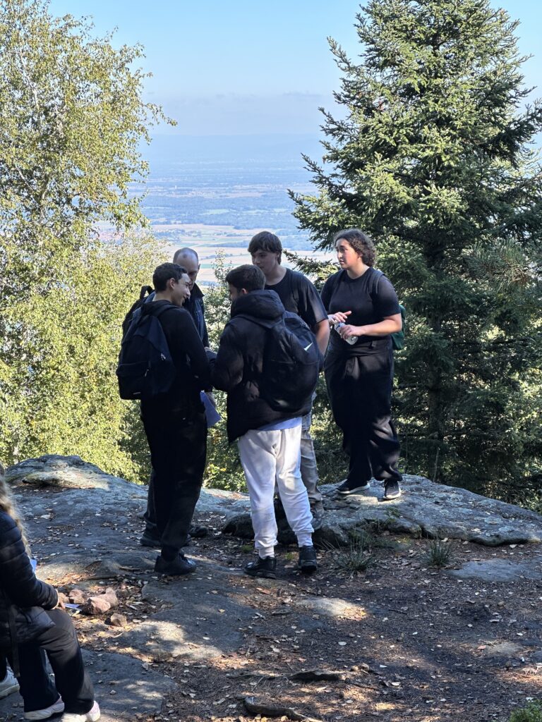 Déposés aux alentours de 9h30 sur le parking surplombant le chateau du Landsberg, les élèves ont dévalé les premiers kilomètres -en descente- sans grande difficulté, découvrant successivement toute une diversité de roches des collines sous-vosgiennes. Le rythme a nettement ralenti l’après-midi, quand il a fallu remonter de quelques centaines de mètres de dénivelé, tout en scrutant les différents affleurement racontant chacun un fragment de l’histoire géologique de la région.