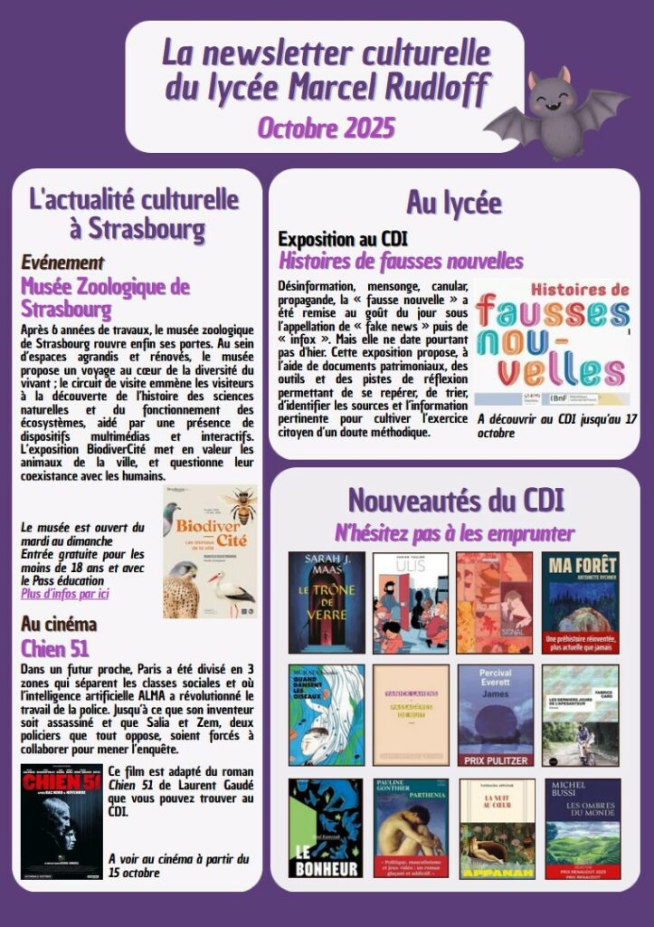La « newsletter culturelle » du lycée Marcel Rudloff Chaque mois, une sélection de l’équipe de professeurs documentalistes du lycée. Les numéros précédents Octobre 2025 Septembre 2025 Mai 2025 Avril 2025 Mars 2025 Février 2025 Janvier 2025 Décembre 2024 Novembre 2024 Septembre 2024