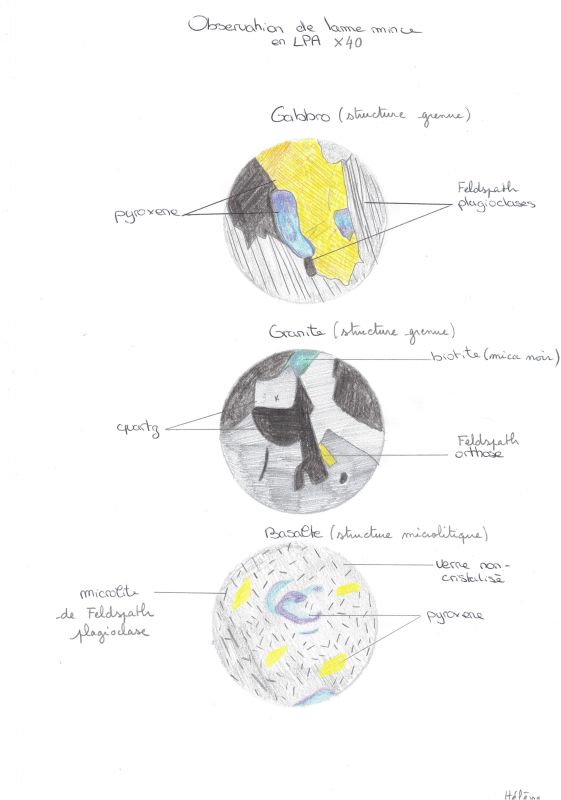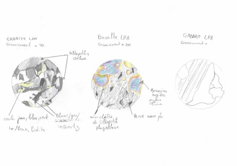 Nos élèves de première spécialité SVT se sont essayé au dessin scientifique sur des lames minces de roche, l’objectif étant de comprendre la structure des roches magmatiques et d’identifier quelques minéraux au microscope polarisant. Voici certains des travaux de nos artistes scientifiques !